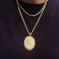 in fusione di metallo placcato oro e cammeo in pasta di resina color avorio